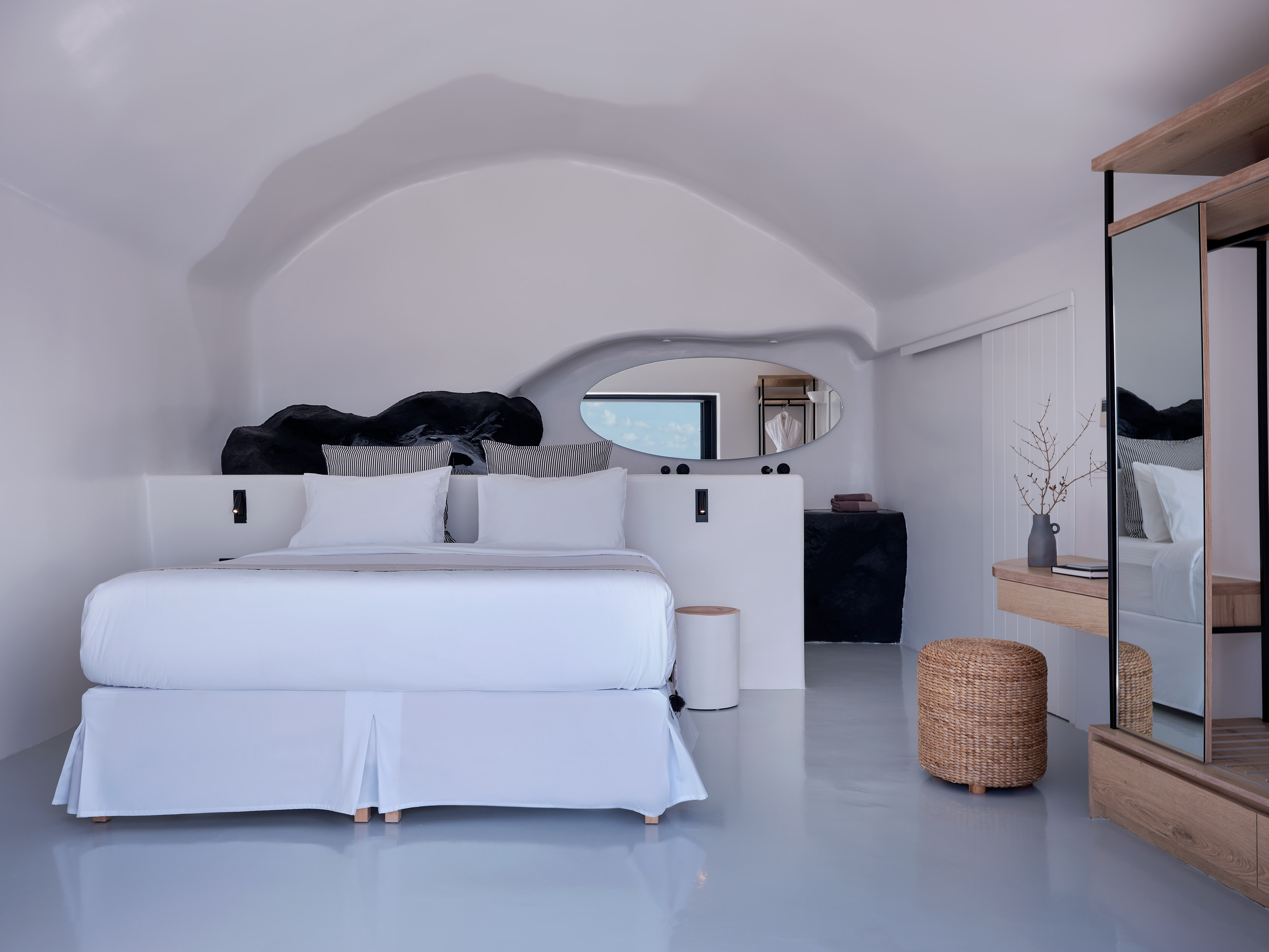 Wake up to the sound of the Aegean breeze and the dreamy view of the sea and the caldera in this elegant suite that sleeps 4 guests in Oia, Santorini. Inside, whitewashed walls and ceilings are complemented by grey and black touches, as well as beautiful wooden accents, all thoughtfully added to create a space that is modern, stylish and seamlessly integrated into its Cycladic surroundings. The outside space is equally inviting; From the private balcony with endless views to the caldera and the sea to the spacious outdoor hot tub, it is the perfect spot to live your Santorini summer to the fullest.